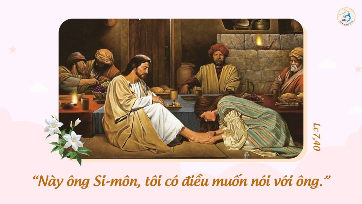 Tin Mừng hôm nay nhắc đến một phụ nữ tội lỗi. Chắc chắn chị này đã được nghe Chúa giảng về tình thương của Thiên Chúa dành cho người tội lỗi và chứng kiến những phép lạ Chúa làm, chị đã cảm nhận lòng khoan dung nhân từ của Chúa. Khi biết Chúa Giêsu dùng bữa tại nhà ông Pharisêu, chị đánh liều tìm đến. Trong khi ông Simon và những người biệt phái xa lánh chị, Chúa Giêsu lại cho phép chị đến gần mà không xua đuổi. Người đón nhận những giọt nước mắt của chị vì Người biết rõ tâm hồn, lòng sám hối và khao khát hoán cải của chị. Chị biết ơn Chúa và đã cảm nhận được lòng thương xót và tha thứ vô biên của Thiên Chúa nơi Chúa Giêsu. Thế nên, mái tóc, vốn là biểu tượng của vẻ đẹp, danh dự và phẩm giá của người phụ nữ Do Thái, chị đã dùng mái tóc đẹp của mình để lau chân Người với tất cả lòng tôn kính, mến yêu. Bất chấp mọi ánh mắt kỳ thị và khinh miệt của những người biệt phái trong bữa tiệc, chị can đảm thể hiện cách chân thành và trọn vẹn lòng sám hối của mình.