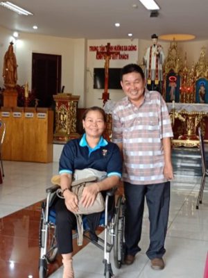 Thế rồi, 22 năm sau, ngày 9/2/2018 con lại bị xe bồn trộn bê tông cán gãy chân còn lại, gãy xương sống, chấn thương tủy. Quá bất ngờ và đau đớn, con nhớ tới Chúa và kêu cầu: “Chúa ơi, xin cứu con!” Con được đưa vào bệnh viện cấp cứu. Vì con không rành rẽ luật, nên số tiền bồi thường vốn đã ít không đủ chi viện phí, mà vẫn còn bị tài xế ăn chia…Con bị tê liệt nửa thân dưới và nhiều di chứng, nằm liệt trên giường hơn năm. Con tưởng mình đã tan xương, nhưng Chúa cho con dần bình phục. Con rất biết ơn Chúa!