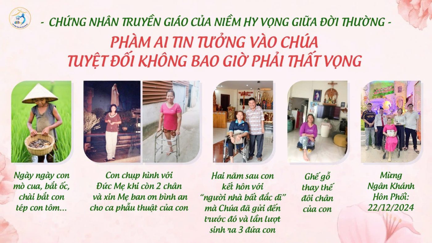 Tạ ơn Chúa cho con ơn can đảm chấp nhận những biến cố đau thương cọ xát của phận người, cho con có đủ sức chịu đựng để vượt qua. Nhìn lại hành trình này, con nghiệm ra: Niềm hy vọng không làm thất vọng vì chúng ta biết mình được Thiên Chúa yêu thương[1], như lời Đức Thánh Cha Phanxicô trong sắc chỉ “Hy vọng không làm thất vọng”. Con đường phía trước còn dài bao nhiêu con không rõ, nhưng con luôn tín thác vào Lòng Thương Xót của Chúa! Chúa đã cho chúng con được hạnh phúc mừng 25 năm hôn phối, chắc chắn Chúa sẽ hoàn tất những gì Chúa đã khởi sự. Xin Chúa bù đắp cho người “bạn đồng hành” Chúa gửi đến đúng lúc cho con, cho ba người con của chúng con những gì đáng lẽ con phải làm cho họ, nhưng con lại không làm được.