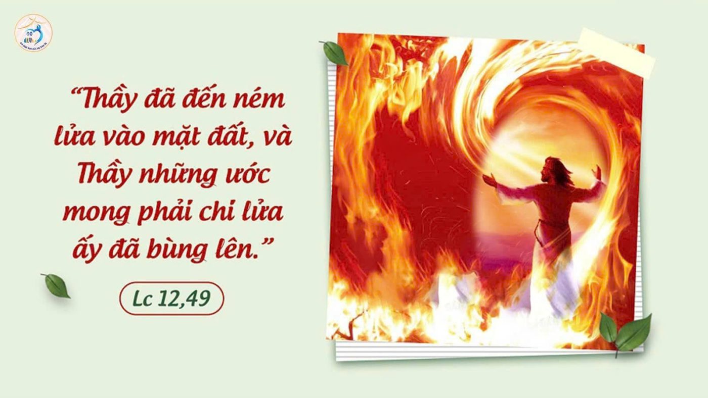 Chúa Giêsu đã đem Ngọn Lửa Thần Linh ấy đến trần gian hơn 2000 năm qua: “Thầy đã đến ném lửa vào mặt đất, và Thầy những ước mong phải chi lửa ấy đã bùng lên!” (c.49). Ngọn Lửa Thánh Thần- Quyền Năng và Tình Yêu của Thiên Chúa đã từng soi sáng cõi lòng u tối của ông Nicôđêmô, xua tan bóng đêm tội lỗi trong tâm hồn những tội nhân như người đàn bà tội lỗi, người thu thế Giakêu… Ngọn lửa đã bừng cháy và sưởi ấm lòng hai môn đệ về Em-mau, ngọn lửa đậu tràn lan trên Đức Maria và các tông đồ ngày lễ Ngũ Tuần, biến đổi các ông từ lo âu, buồn chán và sợ hãi nên những người can đảm loan báo Tin Mừng.