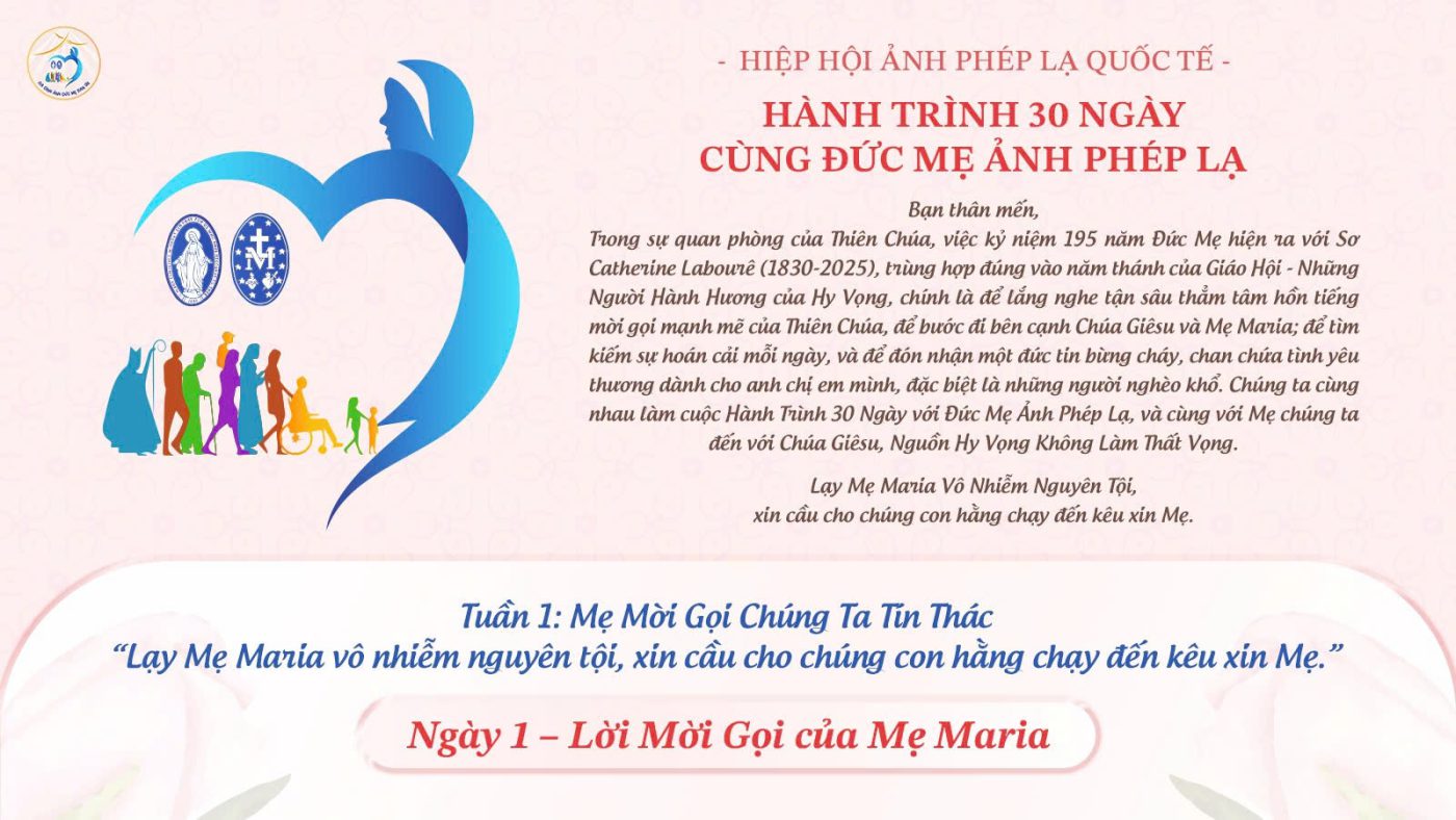 HIỆP HỘI ẢNH PHÉP LẠ QUỐC TẾ Hành Trình 30 Ngày Cùng Đức Mẹ Ảnh Phép Lạ Mục Tiêu: Làm mới lại tình yêu của chúng ta dành cho Đức Trinh Nữ Maria, noi gương các nhân đức của Mẹ, và phó thác bản thân cho sự che chở hiền mẫu của Mẹ qua Ảnh Phép Lạ. Tuần 1: Mẹ Mời Gọi Chúng Ta Tín Thác Ngày 1 – Lời Mời Gọi của Mẹ Maria Suy niệm: Như Thánh Catarina Labouré, tôi cũng được mời gọi lắng nghe tiếng nói dịu dàng của Mẹ Maria đang mời tôi đến gần Con của Mẹ hơn. Mẹ không gọi những người quyền thế, mà gọi những tâm hồn khiêm nhường — những ai sẵn sàng mở lòng đón nhận thánh ý Thiên Chúa. Câu hỏi suy niệm: