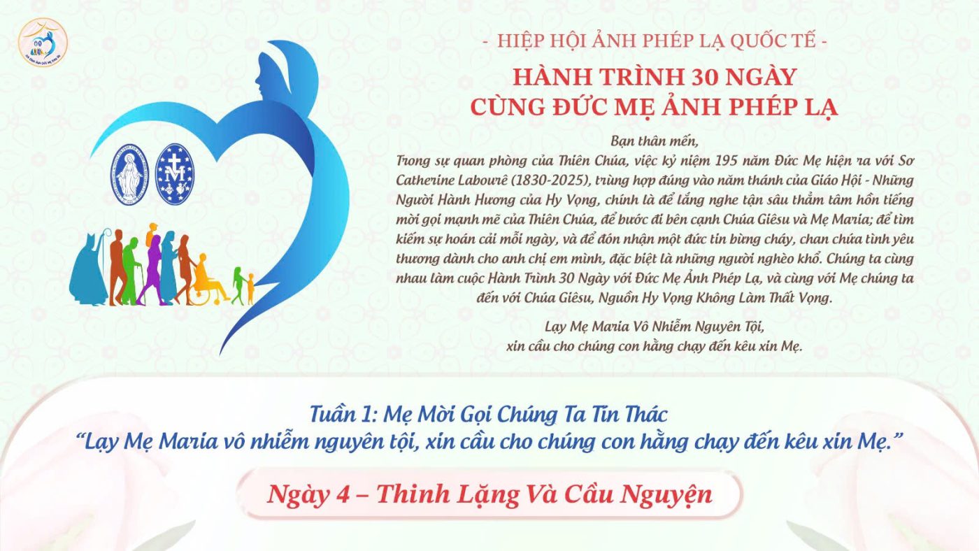 Bạn thân mến,Trong sự quan phòng của Thiên Chúa, việc kỷ niệm 195 năm Đức Mẹ hiện ra với Sơ Catherine Labourê (1830–2025), trùng hợp đúng vào năm thánh của Giáo Hội – Những Người Hành Hương của Hy Vọng, chính là để lắng nghe tận sâu thẳm tâm hồn tiếng mời gọi mạnh mẽ của Thiên Chúa, để bước đi bên cạnh Chúa Giêsu và Mẹ Maria; để tìm kiếm sự hoán cải mỗi ngày, và để đón nhận một đức tin bừng cháy, chan chứa tình yêu thương dành cho anh chị em mình, đặc biệt là những người nghèo khổ. Chúng ta cùng nhau làm cuộc Hành Trình 30 Ngày với Đức Mẹ Ảnh Phép Lạ, và cùng với Mẹ chúng ta đến với Chúa Giêsu, Nguồn Hy Vọng Không Làm Thất Vọng.