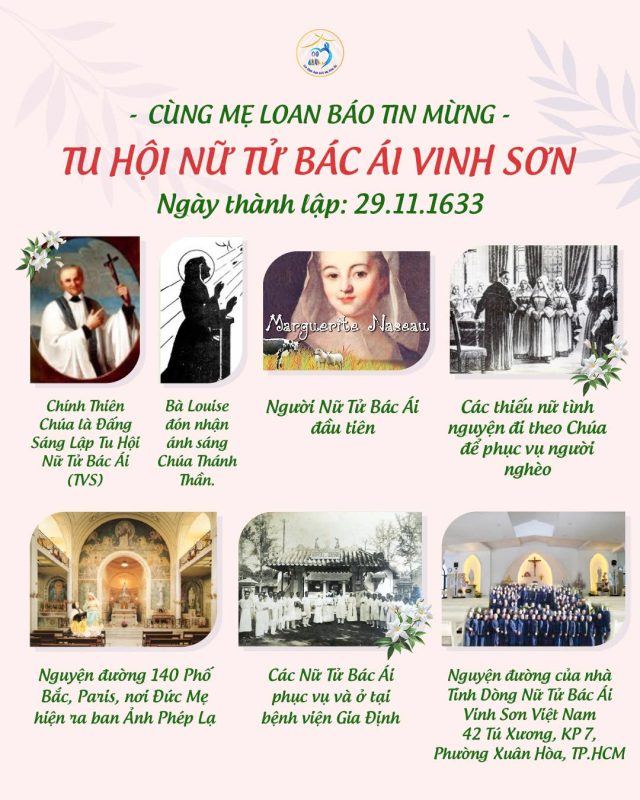 Thế là ngày 29.11.1633: các thiếu nữ tụ họp tại nhà bà Louise de Marillac, dưới sự linh hướng của cha Vinh Sơn. Thiên Chúa đã dùng biến cố này để khai sinh một hình thức tu trì mới trong Giáo Hội. Các thiếu nữ này tận hiến cho Thiên Chúa, nhưng không đóng kín trong 4 bức tường tu viện; trái lại họ “đi đi-lại lại” ở ngoài để phục vụ người nghèo về thể xác và tinh thần. Sống và thực hành bác ái như thế, chính là cách thức Loan Báo Tin Mừng lòng thương xót của Thiên Chúa. Thấy công việc các cô làm, dân chúng đã đặt tên cho các cô là “con gái của bác ái/filles de la charité”: “Chính Thiên Chúa đã ban danh hiệu ấy cho Tu Hội; bởi vì không phải cô Le Gras (bà Louise), không phải cha Portail, cũng không phải cha đã gọi các con là Nữ Tử bác Ái. Nên nhớ rằng khi thấy những điều các con làm và việc phục vụ mà các chị em đầu tiên đã làm cho người nghèo, người ta đã đặt cho các con danh hiệu đó, một danh hiệu rất thích hợp với công việc của các con …”[5].