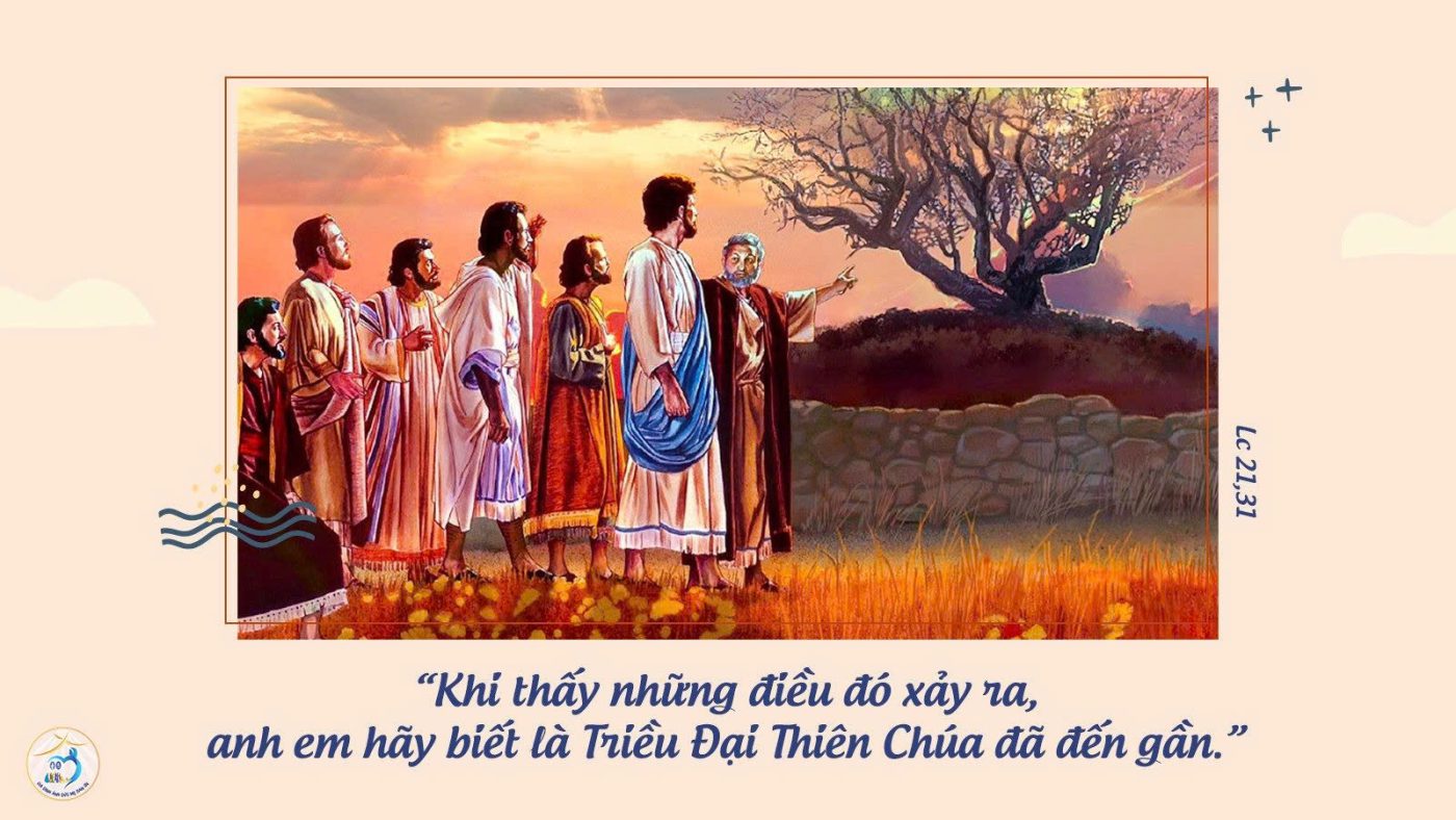 Cũng thế, trong Tin Mừng, Chúa Giêsu nói về những dấu hiệu báo trước việc Nước Thiên Chúa đang đến gần – giữa mọi xáo trộn, hỗn loạn của thời cuộc – như cây đến mùa thay lá. Trời đất sẽ qua đi, quyền lực thế gian rồi sẽ lụi tàn, nhưng Thiên Chúa và quyền năng của Người tồn tại mãi mãi. Điều quan trọng là các môn đệ cần tỉnh thức để đọc ra “dấu chỉ thời đại” qua các biến cố ấy: “Anh em cũng vậy, khi thấy những điều đó xảy ra, thì hãy biết là Triều Đại Thiên Chúa đã đến gần” (c.30).