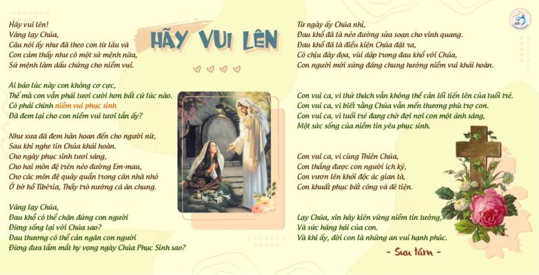 Rồi cùng với Mẹ, chúng ta đi loan báo Tin Mừng Phục Sinh này ra khắp muôn nơi, qua cuộc sống chứng nhân, hầu cho mọi người đều được nghe và nếm cảm Tin Vui này, như lòng Chúa mong ước. Đức Thánh Cha Phanxicô đã khẳng định: “Niềm Vui của Tin Mừng tràn ngập tâm hồn và trọn cuộc sống của những ai gặp gỡ Đức Giêsu”[3]. Và Niềm Vui của Tin Mừng này phải là dấu ấn trong việc truyền giáo của Giáo Hội cho thời đại này[4].